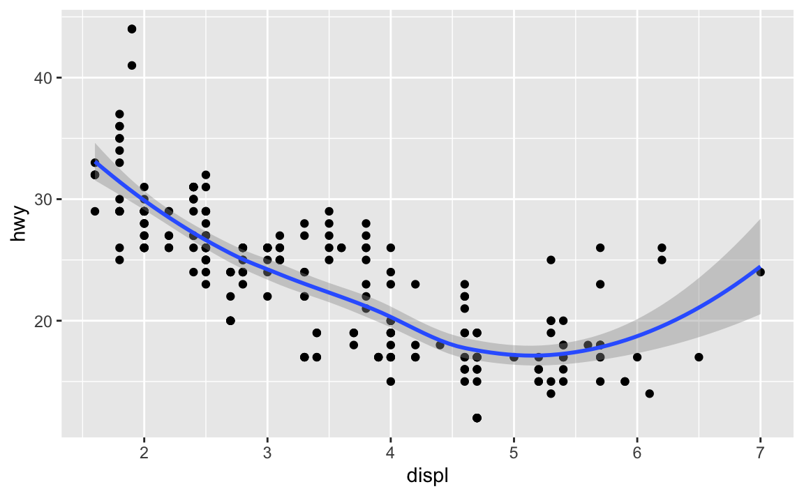 ggplot(mpg, aes(x = displ, y = hwy)) +
