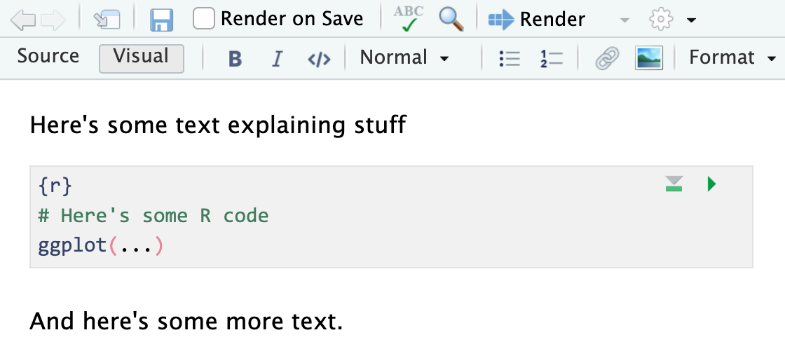 If you notice that your document is looking funny, switch to the source editor and make sure the chunk ends with triple backticks: