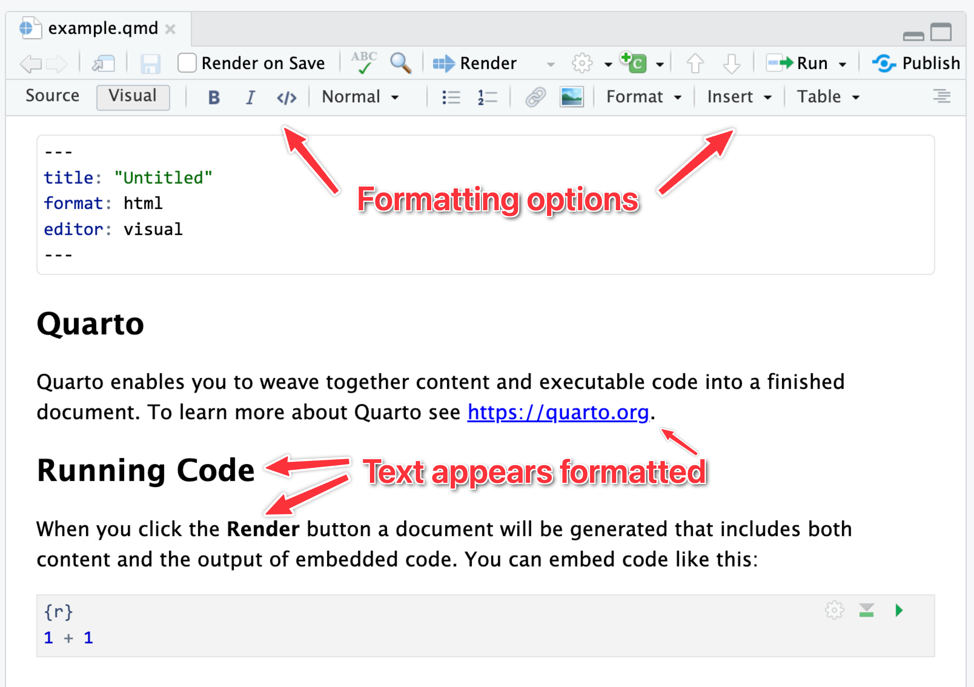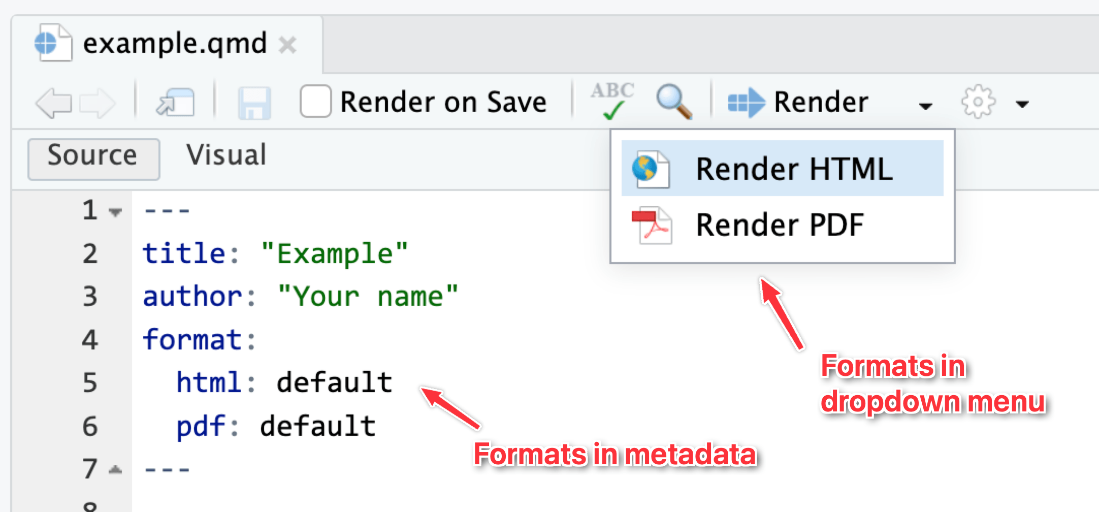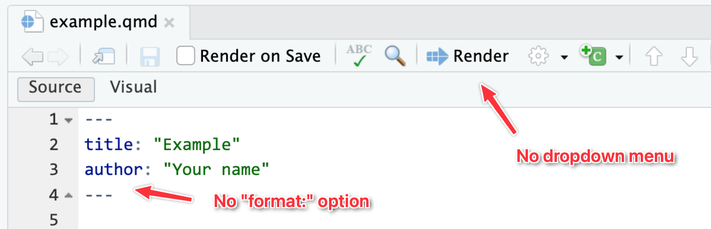 settings in the top part of your document (i.e. the metadata), Quarto documents by default render to HTML. The “Render” button at the top of the editor window won’t have a dropdown menu for switching to other formats—if you click on it, it’ll render to HTML.