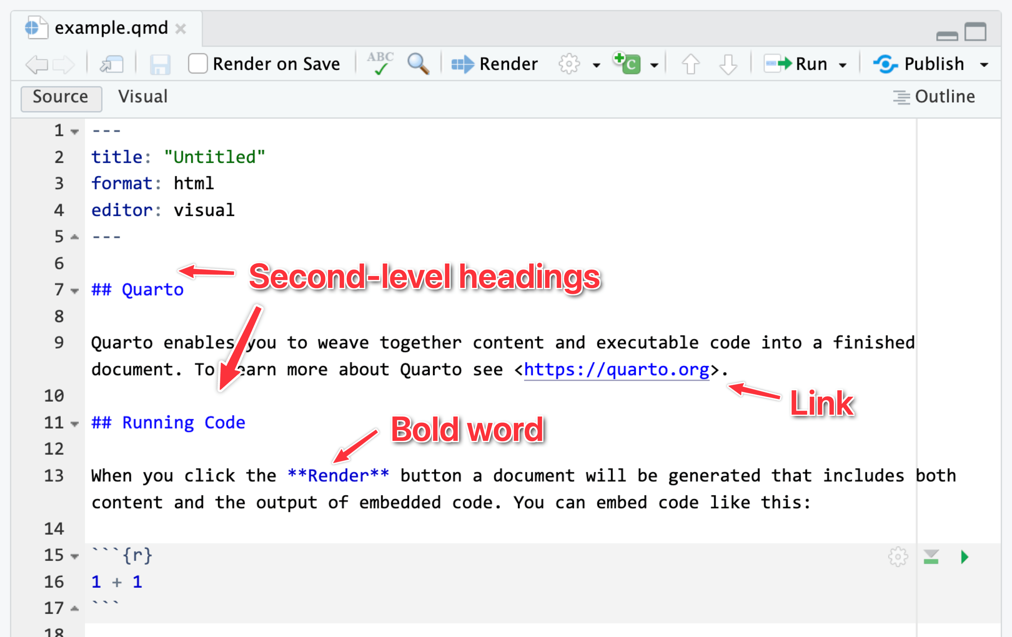 It can be tricky to remember all the different Markdown-y things you can use, so RStudio has a visual mode to help you! Visual mode gives you a Word-like menu for formatting text, and it shows the formatted text in the editor window. Behind the scenes, it’s really using Markdown—if you switch to source mode, you can see the underlying Markdown, like ## A heading