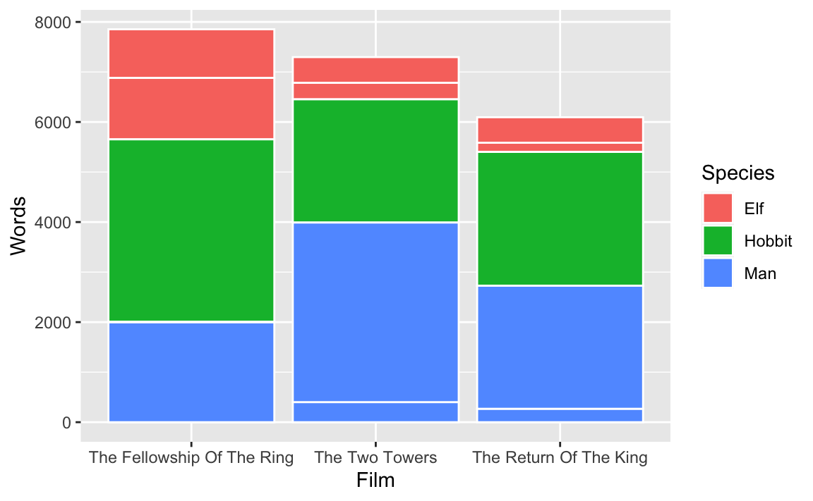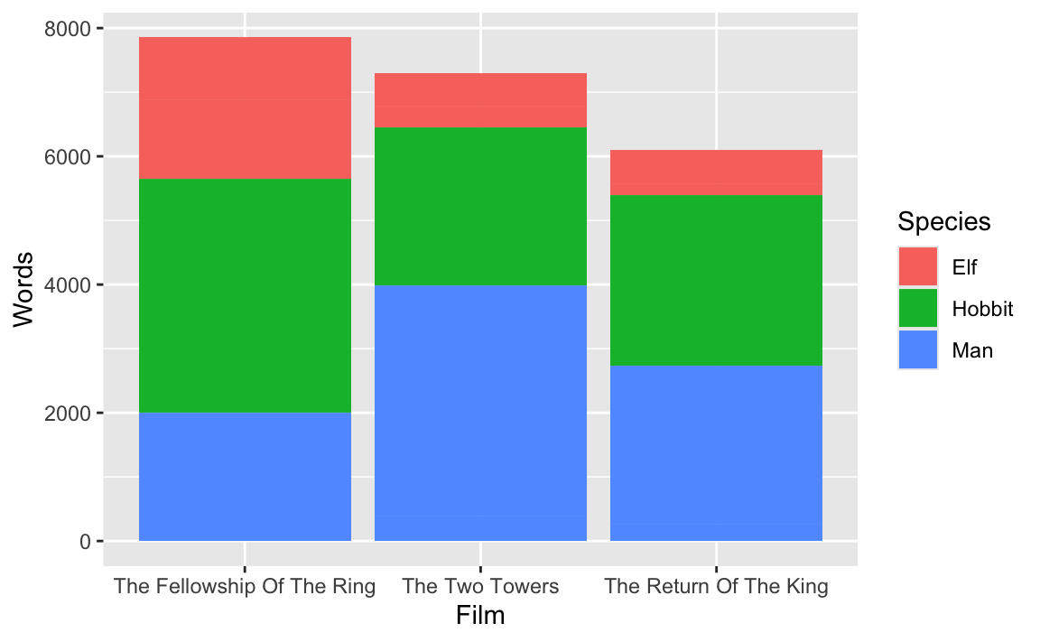 mapping = aes(x = Film, y = Words, fill = Species)