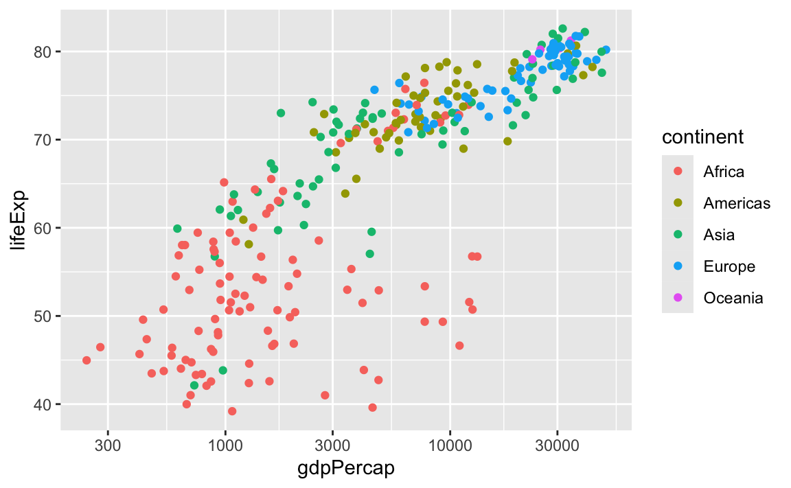 ggplot(gapminder_small, aes(x = gdpPercap, y = lifeExp, fill = continent)) +