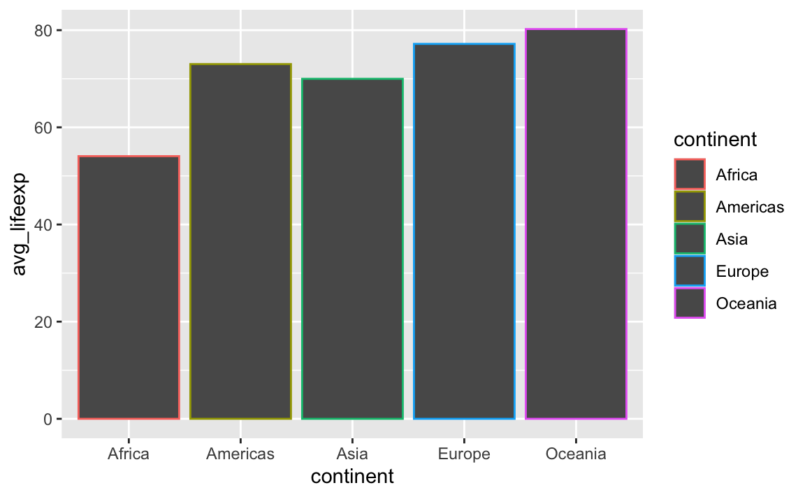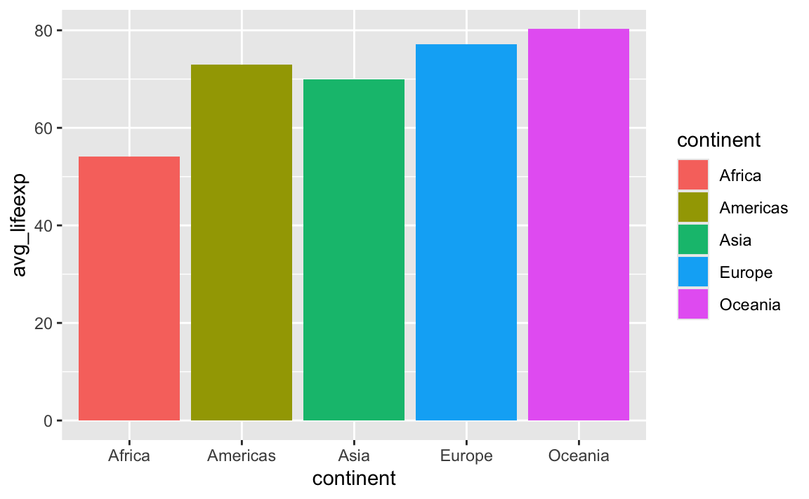 gapminder_avg_lifeexp,aes(x = continent, y = avg_lifeexp, fill = continent)