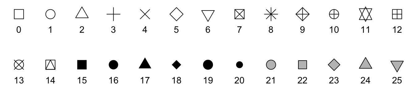 R and ggplot have 26 possible shapes that you can use, and they’re numbered 0–25. You can see what they are in the documentation if you run ?pch