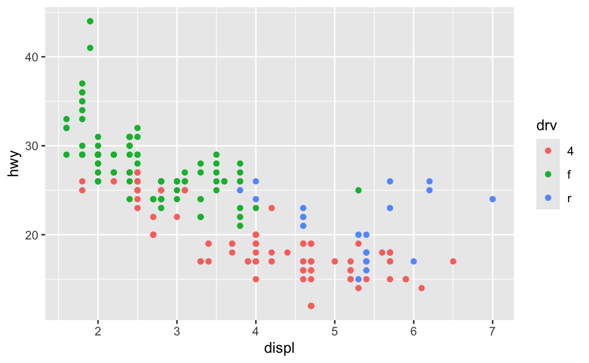 ggplot(data = mpg, mapping = aes(x = displ, y = hwy, color = drv)) +