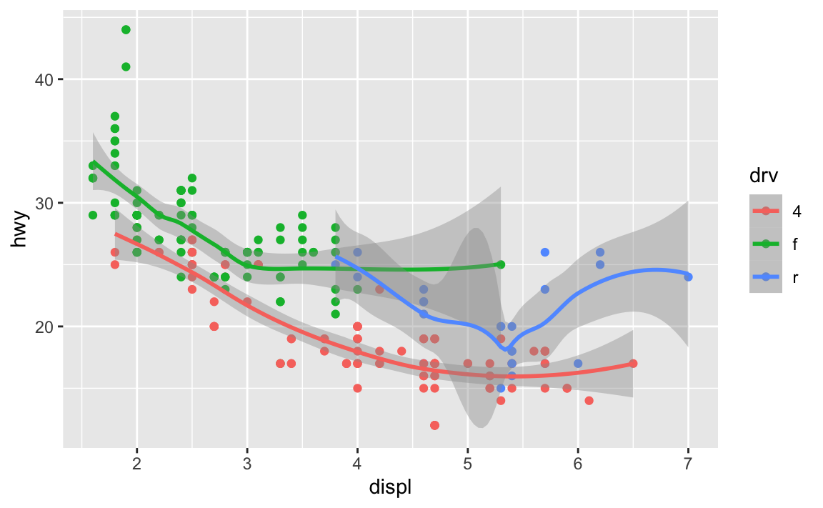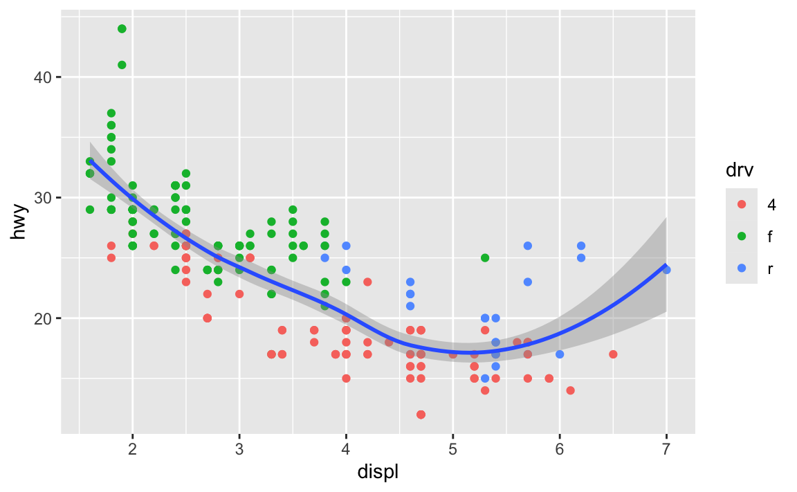 geom_smooth(mapping = aes(x = displ, y = hwy, color = drv))