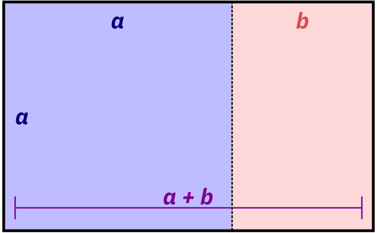 More formally and mathematically, it’s a rectangle where the ratio of the height and width of the subshapes are special values. Note how here the blue square is a perfect square with side lengths a, while the red rectangle is another smaller golden rectangle with side lengths a and b: