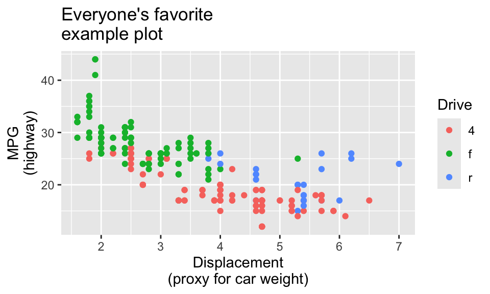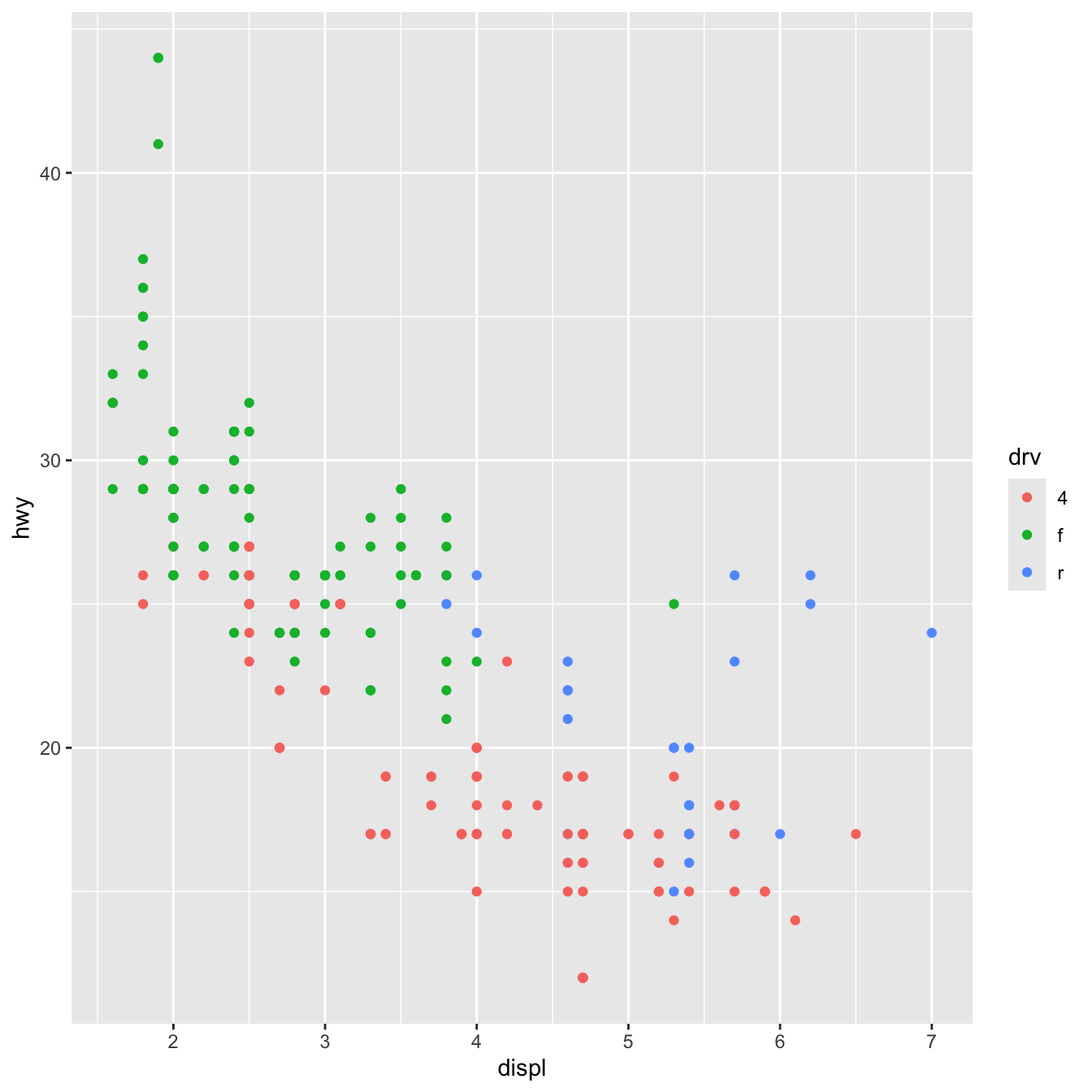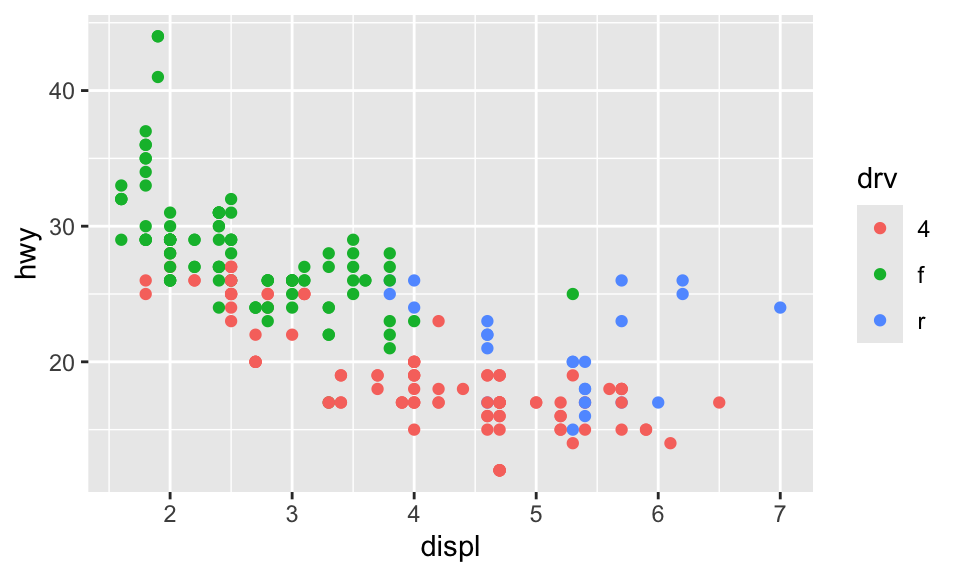 ggplot(data = mpg, mapping = aes(x = displ, y = hwy, color = drv)) +