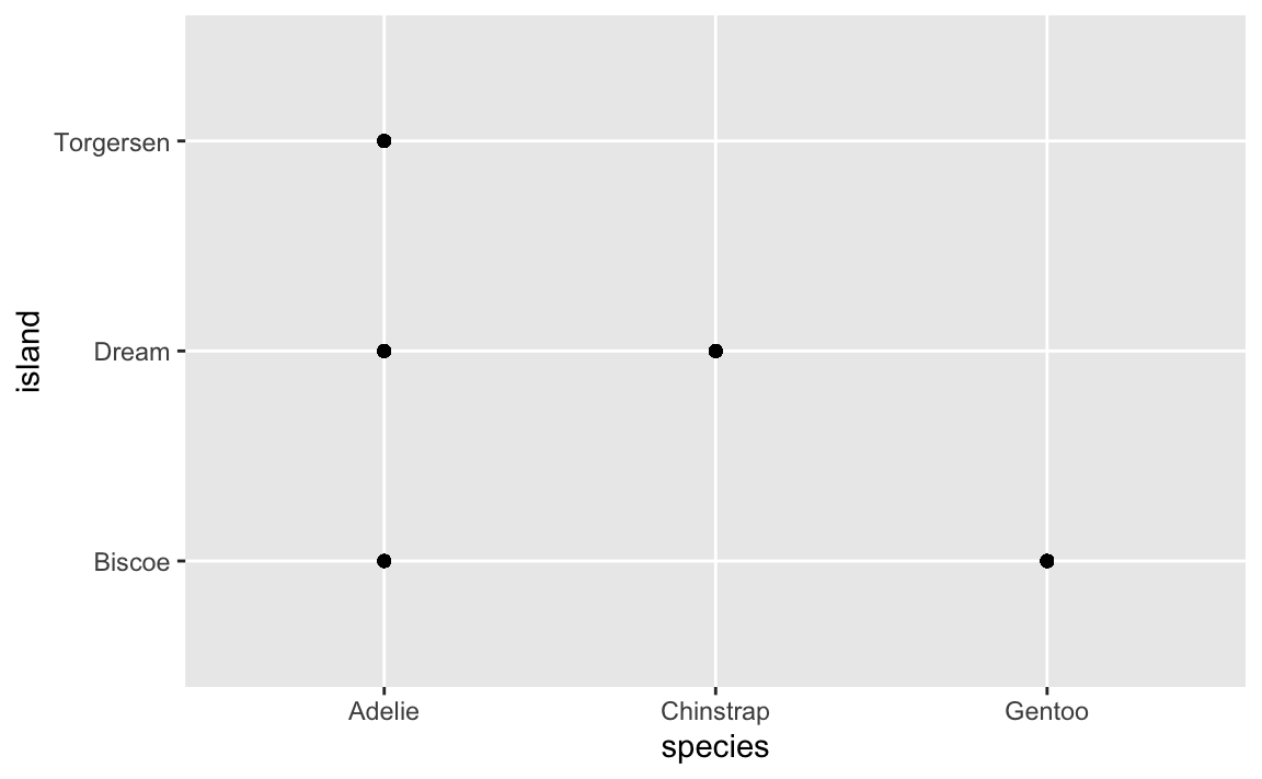 ggplot(penguins, aes(x = species, y = island)) +
