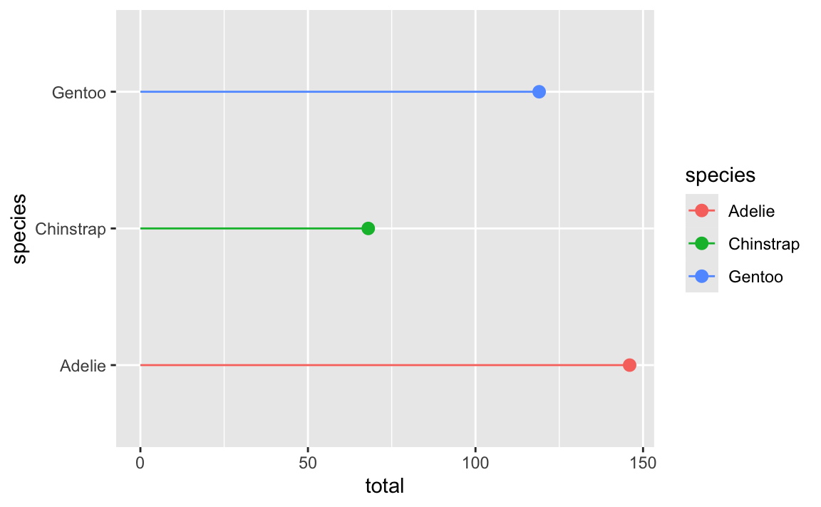 ggplot(penguin_counts, aes(y = species, x = total, color = species)) +