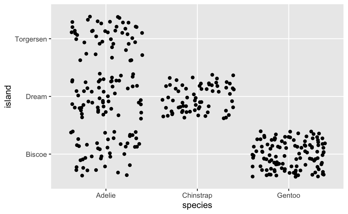 Jittering in this case is totaly fine and good because moving a point from the very middle of the Adelie axis mark on the x-axis to a little bit left of the axis mark doesn’t distort the fact that it’s still an Adelie.