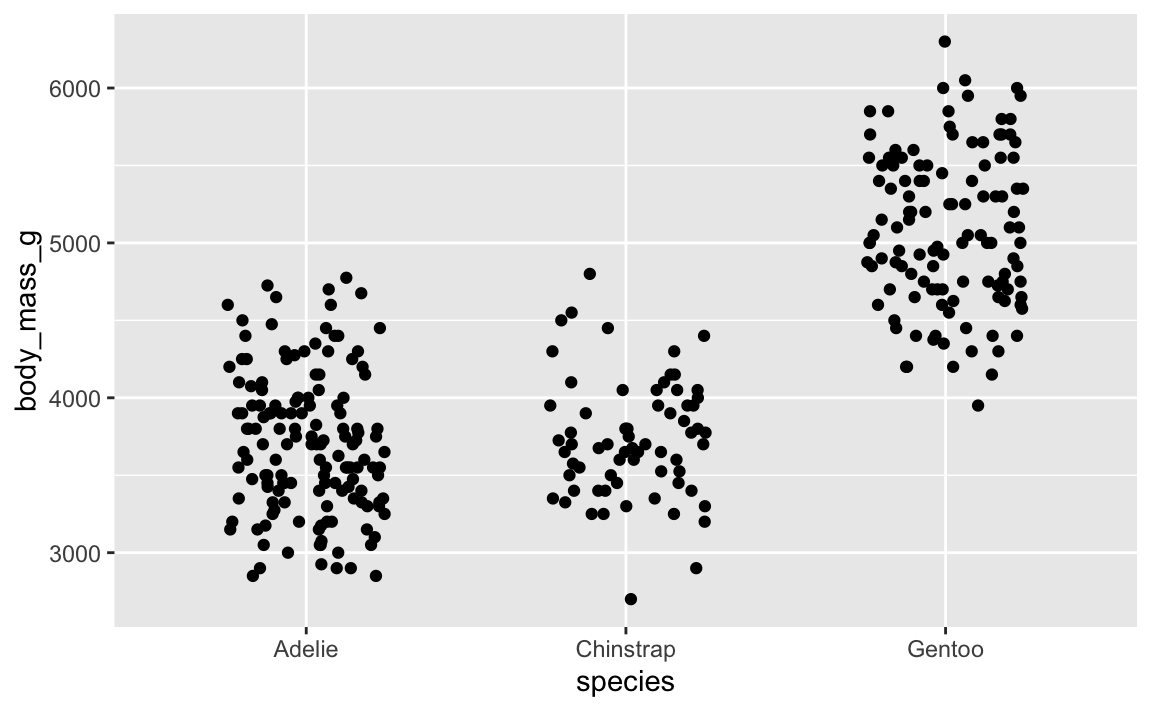 That’s not very helpful since there are so many points still stacked on each other. We can jitter this horizontally, but not vertically. If we jitter vertically, we’ll randomly add/substract body mass from each penguin, which we don’t want to do: