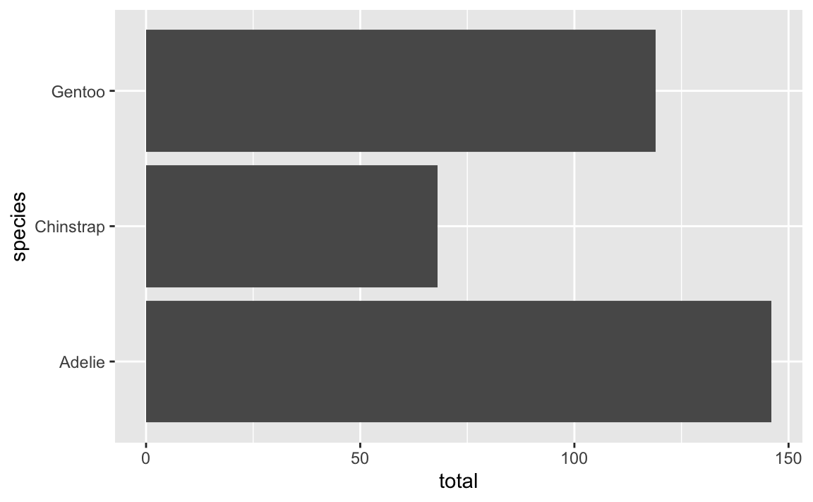 ggplot(penguin_counts, aes(x = total, y = species)) +