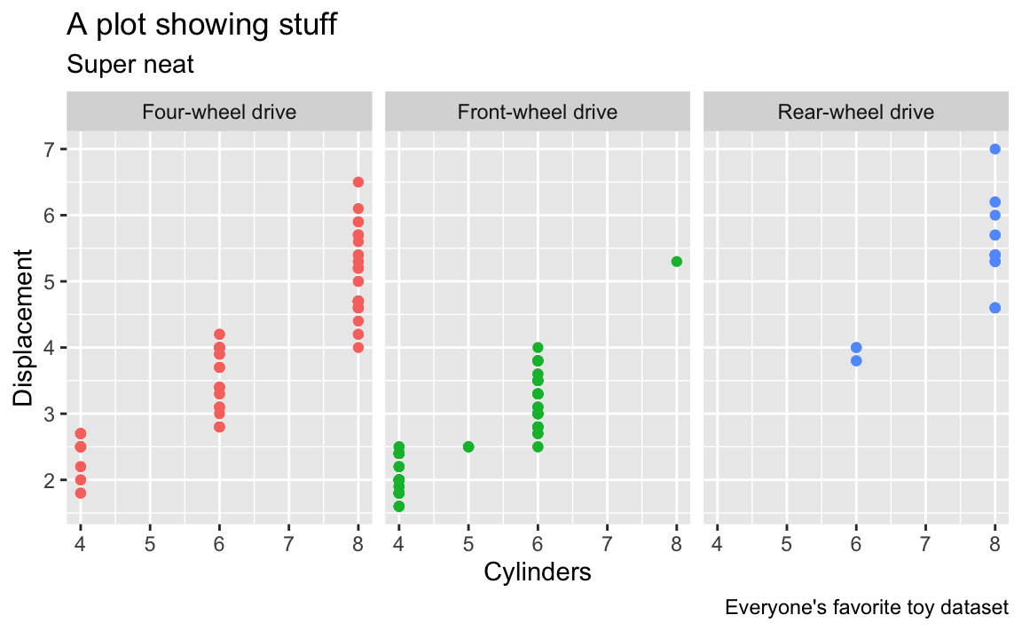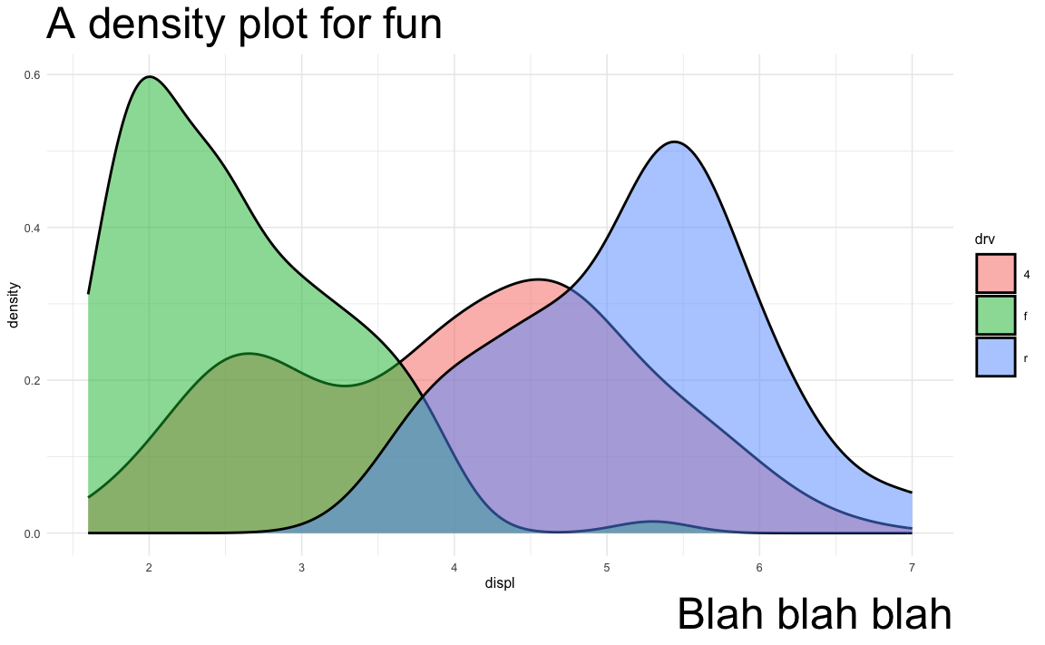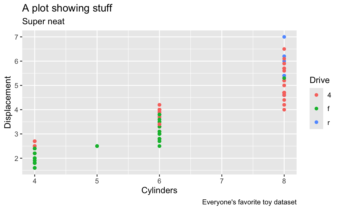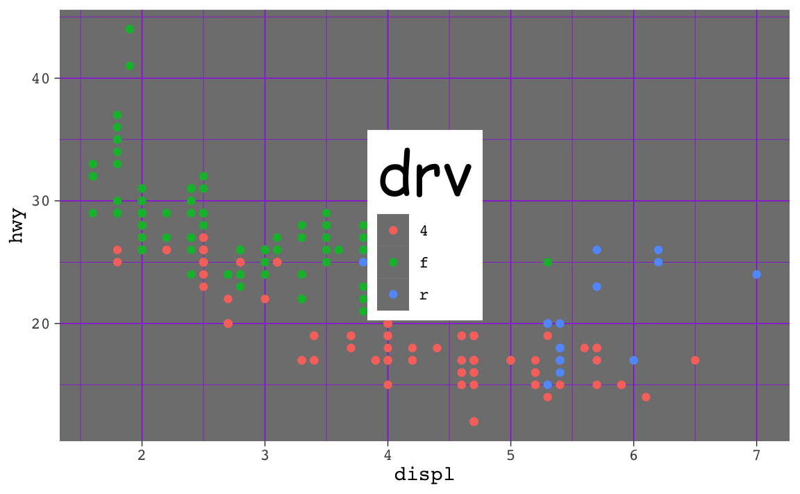 <- ggplot(mpg, aes(x = displ, y = hwy, color = drv)) +