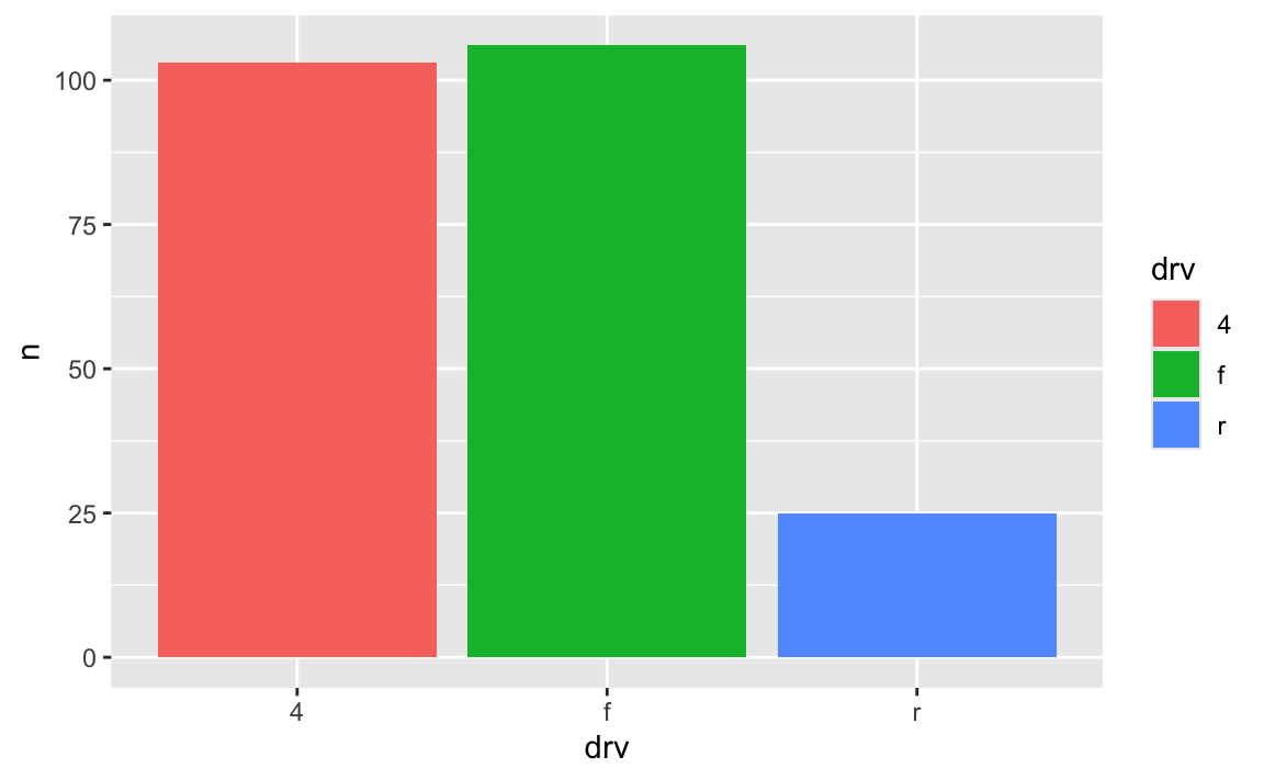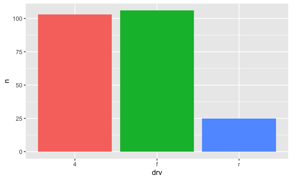 ggplot(car_counts, aes(x = drv, y = n, fill = drv)) +