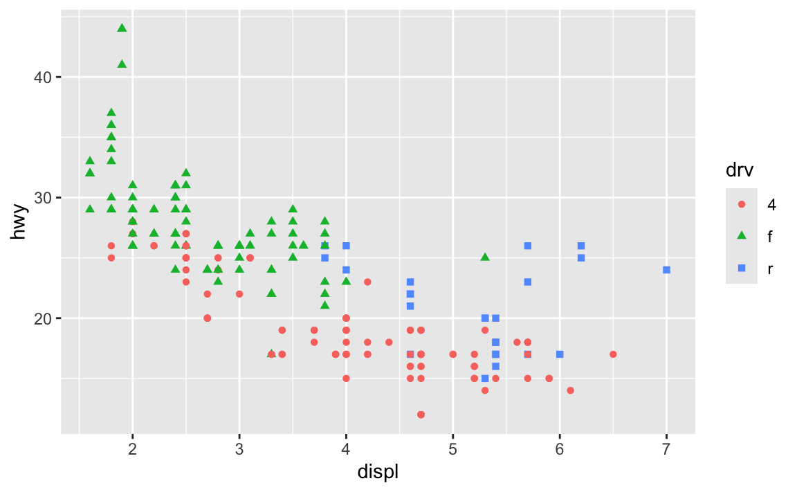 ggplot(mpg, aes(x = displ, y = hwy, color = drv, shape = drv)) +
