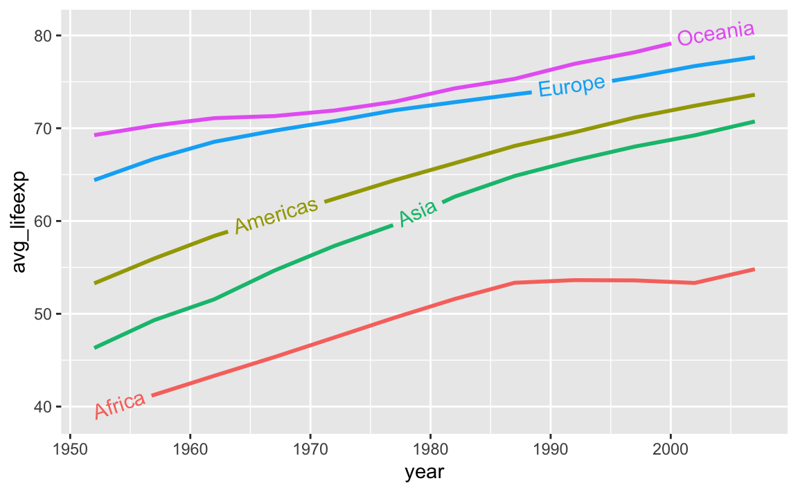 gapminder_lifeexp, aes(x = year, y = avg_lifeexp, color = continent)