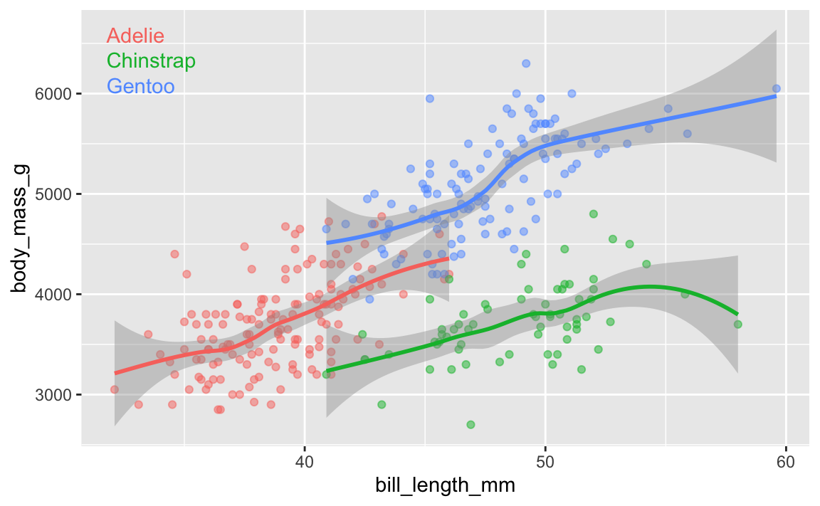 penguins, aes(x = bill_length_mm, y = body_mass_g, color = species)