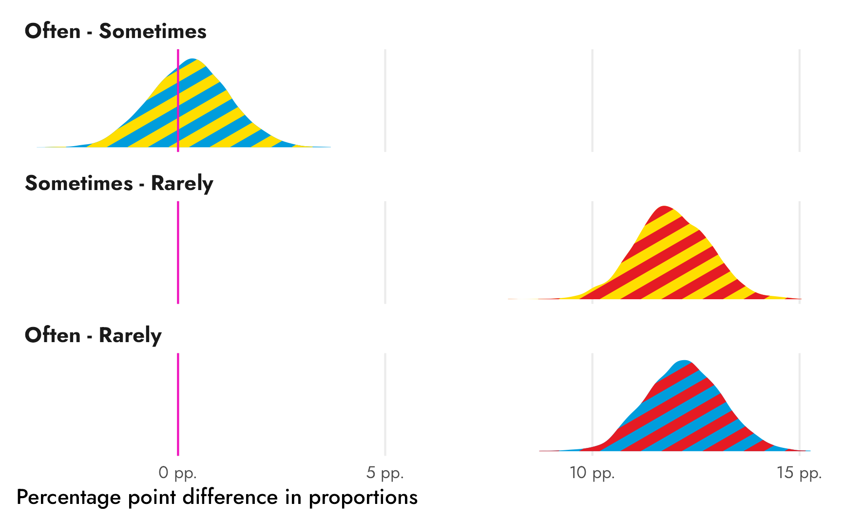 I use it here to fill things that show the differences between categories. Like “Often” is blue, “Sometimes” is yellow, and “Rarely” is red, so these densities show the differences between those categories (often minus sometimes is blue and yellow, etc.):