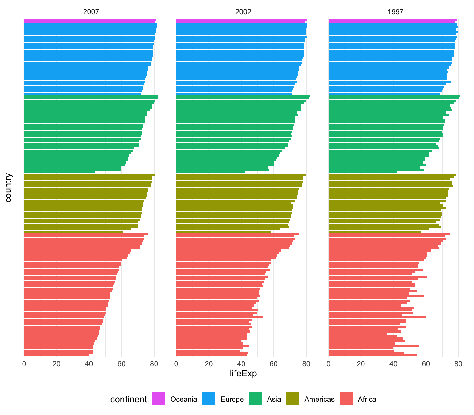 That’s only one line instead of two, which is nice, but I tend to be fan of the two step approach because it’s more explicit and gives me more control over sorting. For instance, here I want all the gapminder countries to be sorted by year (descending), continent, and life expectancy so we can see descending life expectancy within each continent over time.