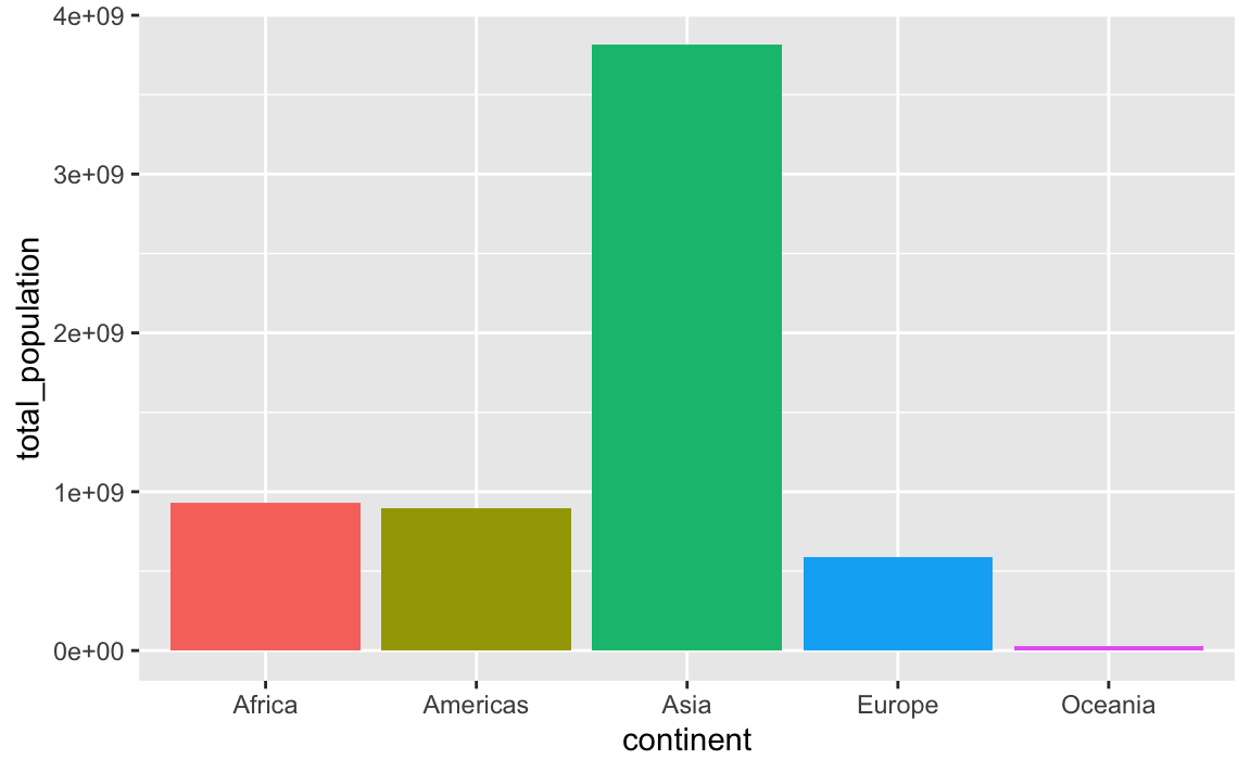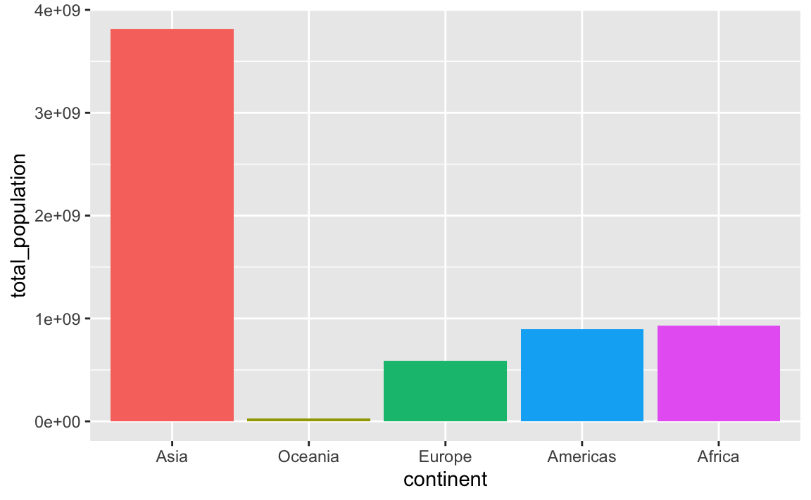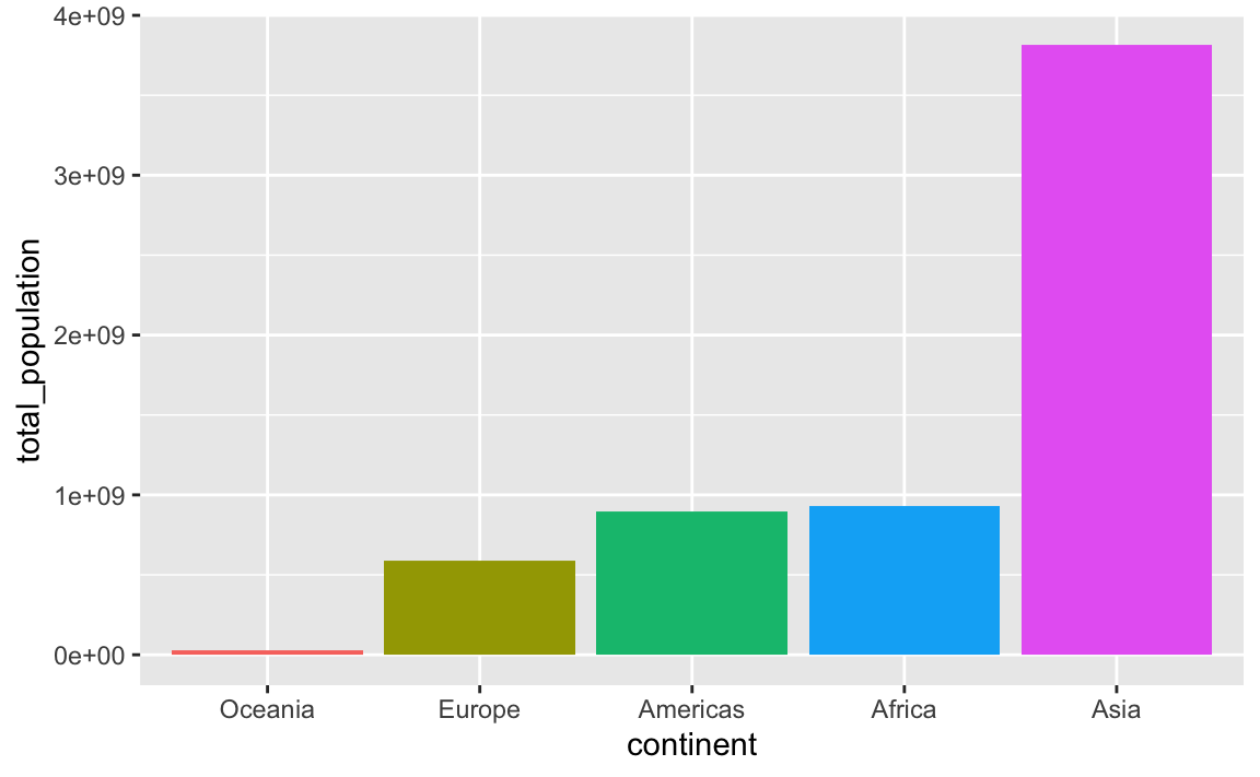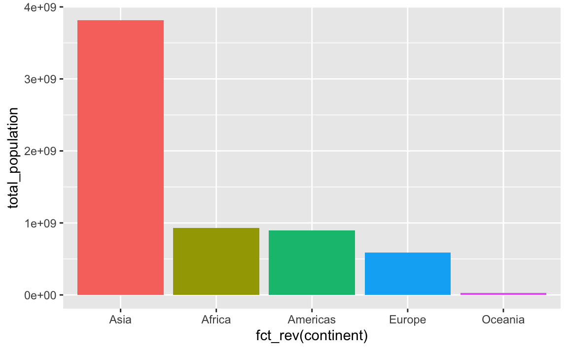 This plots the continents in reverse order, with Oceania on the left. We can reverse this by either arranging the data in descending population order, or by using fct_rev() to reverse the continent order: