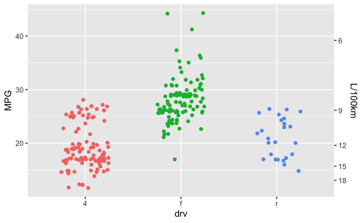 Like here’s a dual axis chart showing miles per gallon (a standard measure in the United States) on one side and liters per 100 km (a standard measure in the rest of the world) on the other side. This is legal and fine and good because the measure is fuel efficiency—it’s just displayed two different ways: