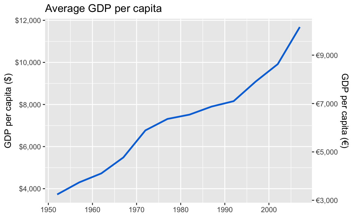 p1 <- ggplot(gapminder_plot_data, aes(x = year, y = avg_gdpPercap)) +