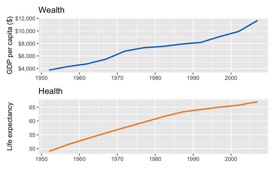 labs(x = NULL, y = "GDP per capita ($)", title = "Wealth")