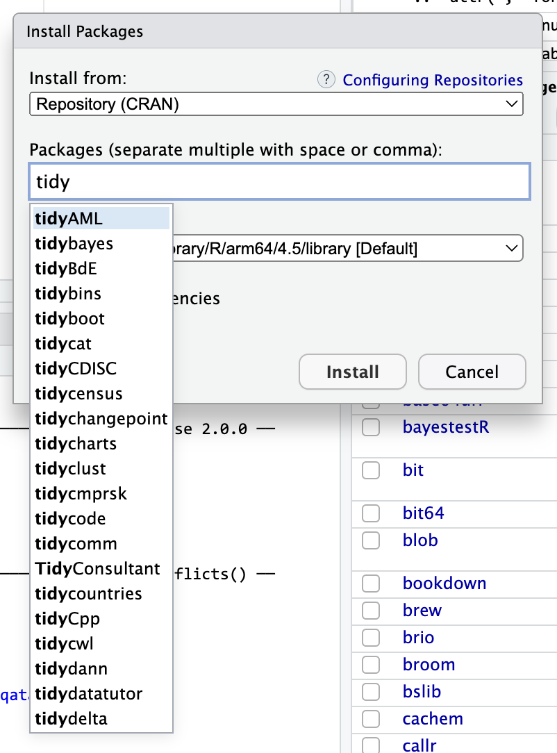 Some packages that start with “gg” You can do the same thing with other larger ecosystems. Start typing “tidy” and you’ll see things like {tidycensus} (which lets you grab data from the US Census API) and {tidybayes} (which lets you work with Bayesian models in a tidy way).