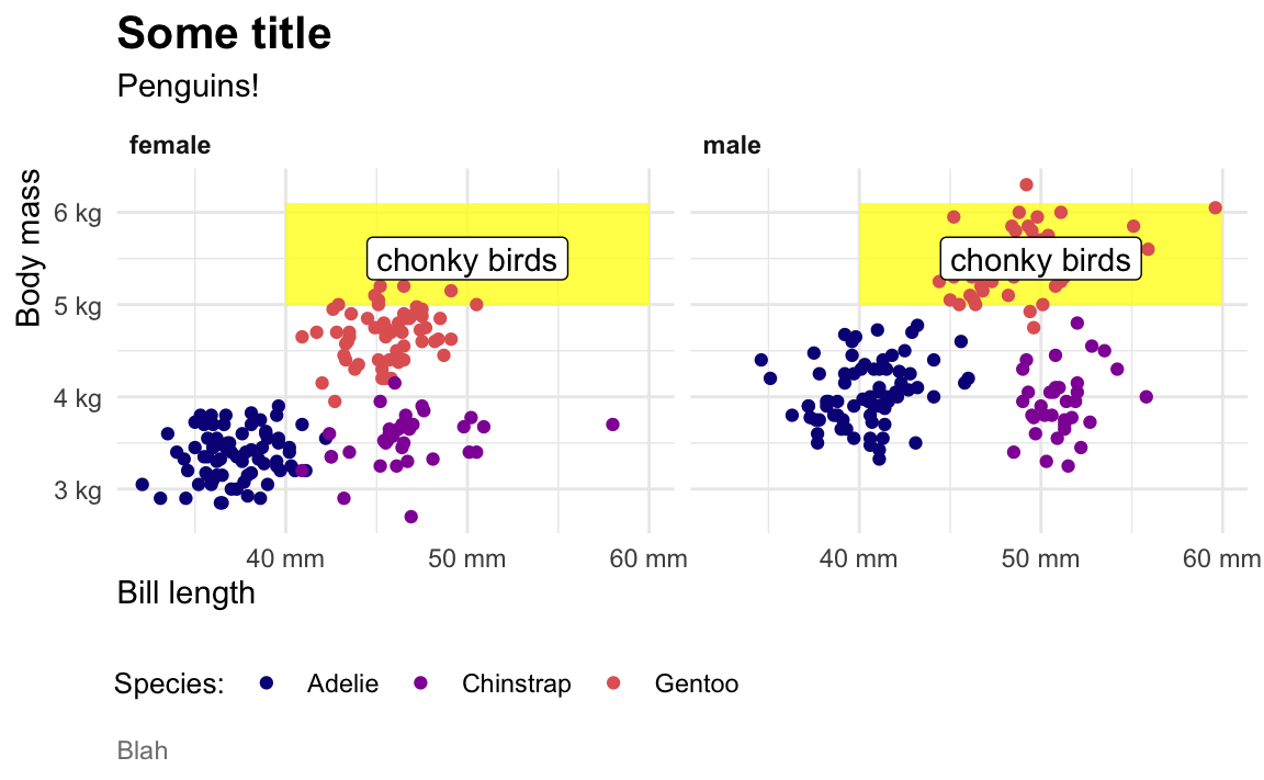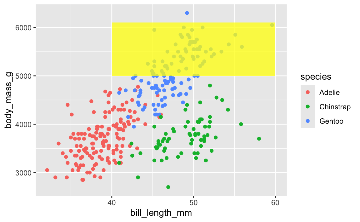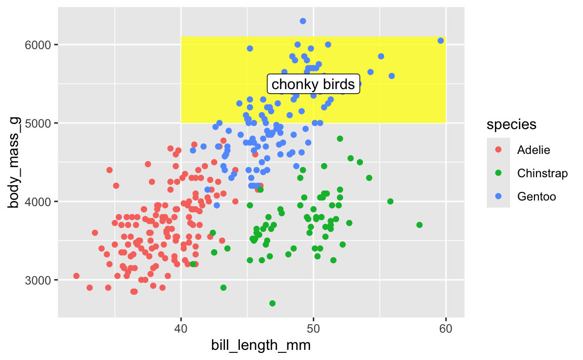 ggplot(penguins, aes(x = bill_length_mm, y = body_mass_g, color = species)) +# Yellow rectangle behind everythingannotate(geom ="rect", xmin =40, xmax =60, ymin =5000, ymax =6100,fill ="yellow", alpha =0.75) +# Pointsgeom_point() +# Label on top of the points and the rectangleannotate(geom ="label", x =50, y =5500, label ="chonky birds")