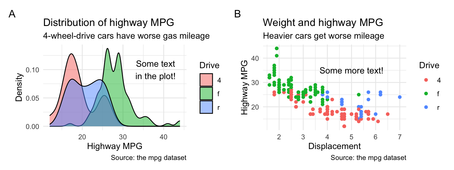 library(tidyverse)library(patchwork)p1 <-ggplot(mpg, aes(x = hwy, fill = drv)) +geom_density(alpha =0.5) +# Here's some arbitrary text *inside* the plotannotate(geom ="text", x =38, y =0.10, label ="Some text\nin the plot!" ) +# Here's some text *outside* the plotlabs(# These are all aesthetics that we set with aes()x ="Highway MPG", y ="Density", fill ="Drive",# These are general title-y thingstitle ="Distribution of highway MPG",subtitle ="4-wheel-drive cars have worse gas mileage",caption ="Source: the mpg dataset",tag ="A" ) +theme_minimal()p2 <-ggplot(mpg, aes(x = displ, y = hwy, color = drv)) +geom_point() +# Here's some arbitrary text *inside* the plotannotate(geom ="text", x =5, y =35, label ="Some more text!") +# Here's some text *outside* the plotlabs(# These are all aesthetics that we set with aes()x ="Displacement", y ="Highway MPG", color ="Drive",# These are general title-y thingstitle ="Weight and highway MPG",subtitle ="Heavier cars get worse mileage",caption ="Source: the mpg dataset",tag ="B" ) +theme_minimal()p1 | p2