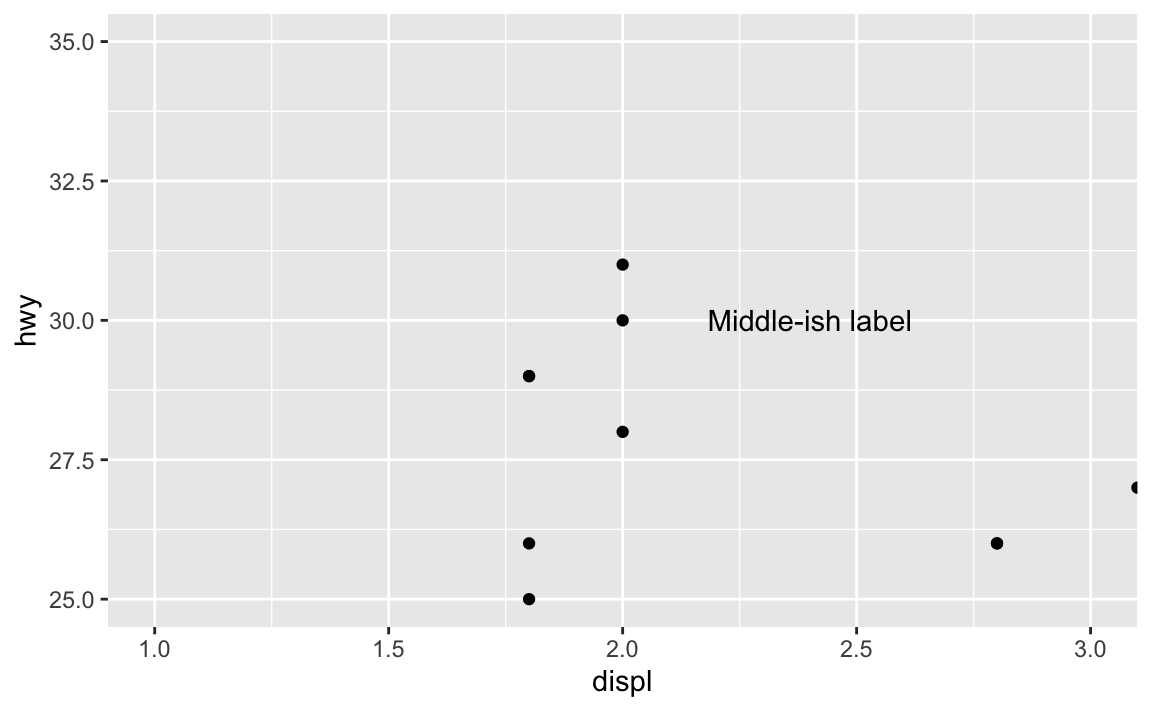 ggplot(mpg_small, aes(x = displ, y = hwy)) +geom_point() +annotate(geom ="text", x =2.4, y =30, label ="Middle-ish label") +coord_cartesian(xlim =c(1, 3), ylim =c(25, 35))