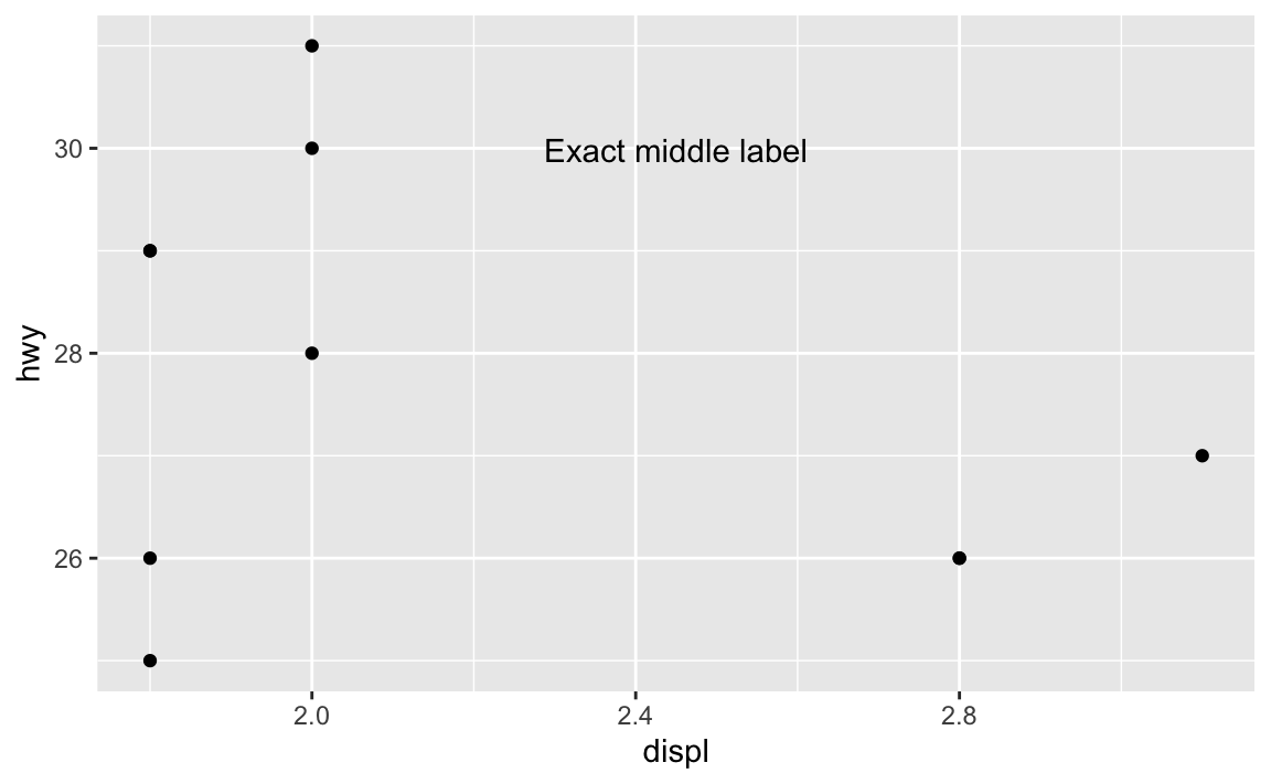 ggplot(mpg_small, aes(x = displ, y = hwy)) +geom_point() +annotate(geom ="text", x =I(0.5), y =I(0.8), label ="Exact middle label")