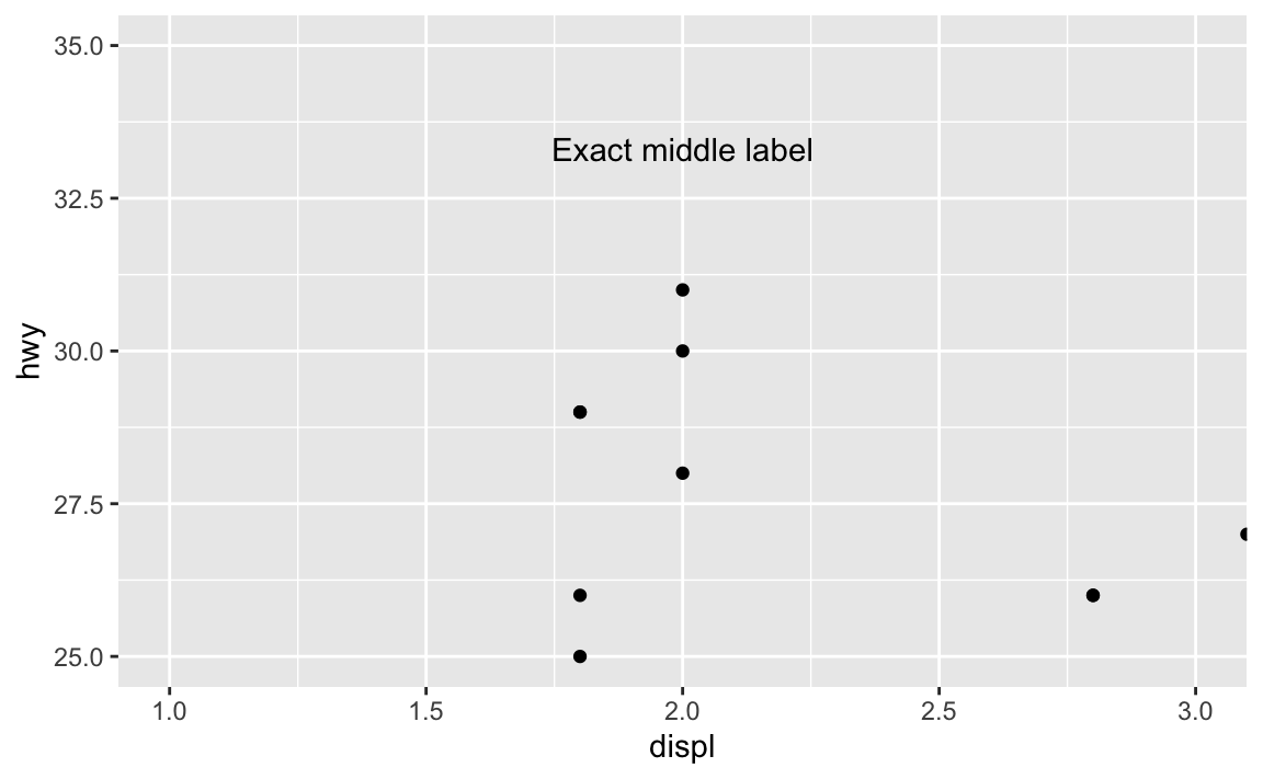 ggplot(mpg_small, aes(x = displ, y = hwy)) +geom_point() +annotate(geom ="text", x =I(0.5), y =I(0.8), label ="Exact middle label") +coord_cartesian(xlim =c(1, 3), ylim =c(25, 35))