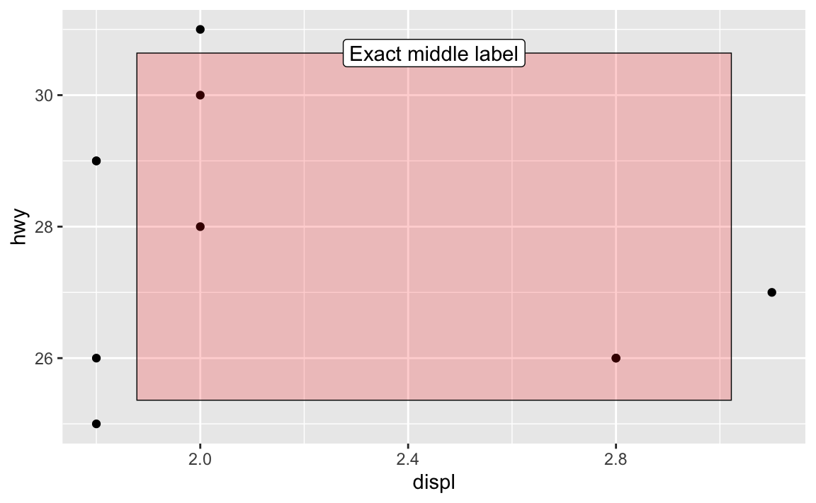 ggplot(mpg_small, aes(x = displ, y = hwy)) +geom_point() +annotate(geom ="rect", xmin =I(0.1), xmax =I(0.9), ymin =I(0.1), ymax =I(0.9),color ="black", linewidth =0.25, fill ="red", alpha =0.2 ) +annotate(geom ="label", x =I(0.5), y =I(0.9), label ="Exact middle label")