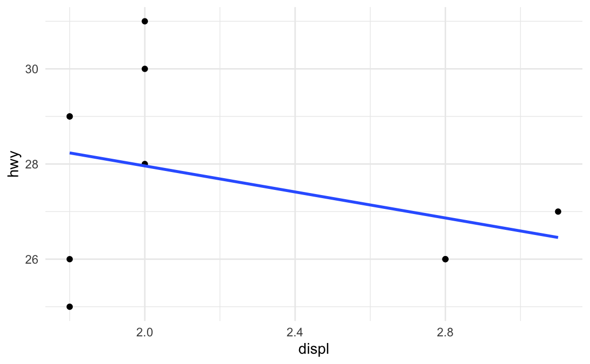 ggplot(mpg_small, aes(x = displ, y = hwy)) +geom_point() +geom_smooth(method ="lm", se =FALSE)