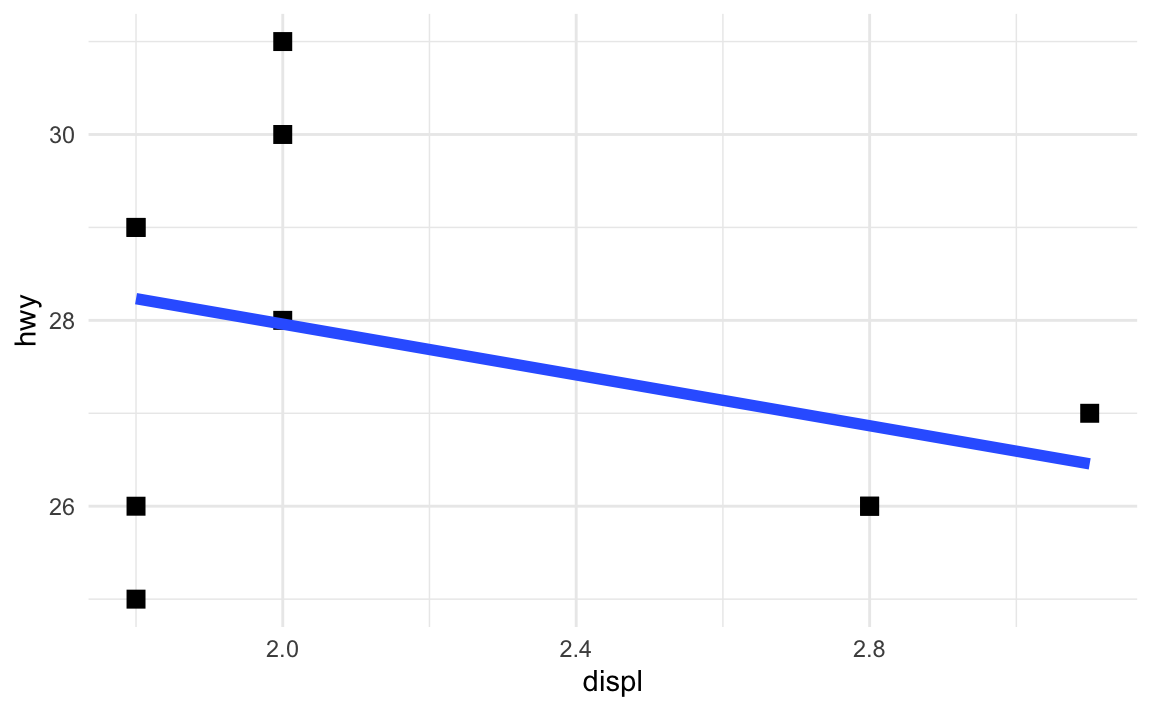 ggplot(mpg_small, aes(x = displ, y = hwy)) +geom_point(size =3, shape ="square") +geom_smooth(method ="lm", se =FALSE, linewidth =2)