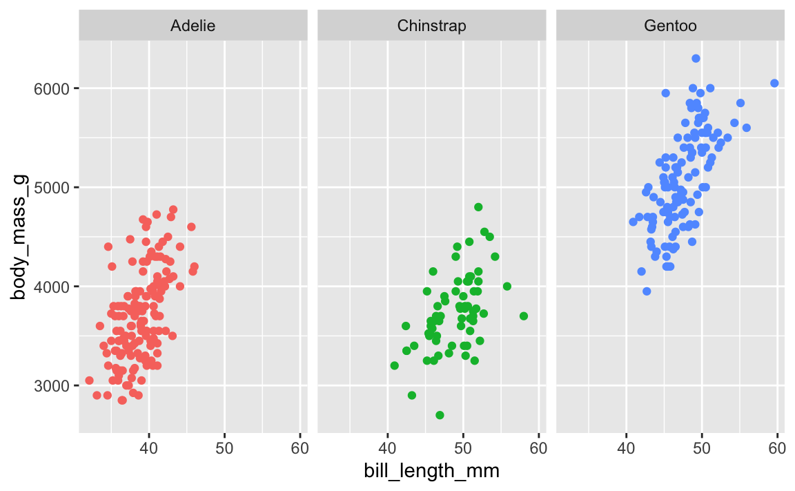 library(palmerpenguins)penguins <- palmerpenguins::penguins |>drop_na(sex)ggplot(penguins, aes(x = bill_length_mm, y = body_mass_g, color = species)) +geom_point() +guides(color ="none") +# No need for a legend since we have facetsfacet_wrap(vars(species))