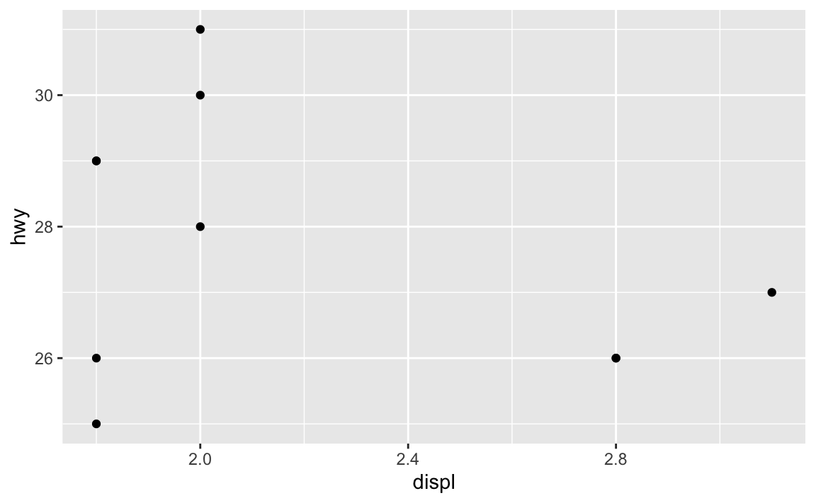 # Just use the first ten rows of mpgmpg_small <- mpg |>slice(1:10)ggplot(mpg_small, aes(x = displ, y = hwy)) +geom_point()