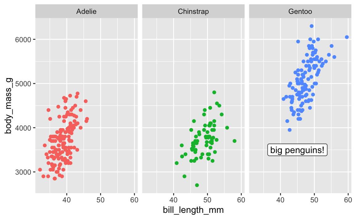 ggplot(penguins, aes(x = bill_length_mm, y = body_mass_g, color = species)) +geom_point() +guides(color ="none") +# No need for a legend since we have facetsfacet_wrap(vars(species)) +annotate(geom ="label", x =45, y =3500, label ="big penguins!")