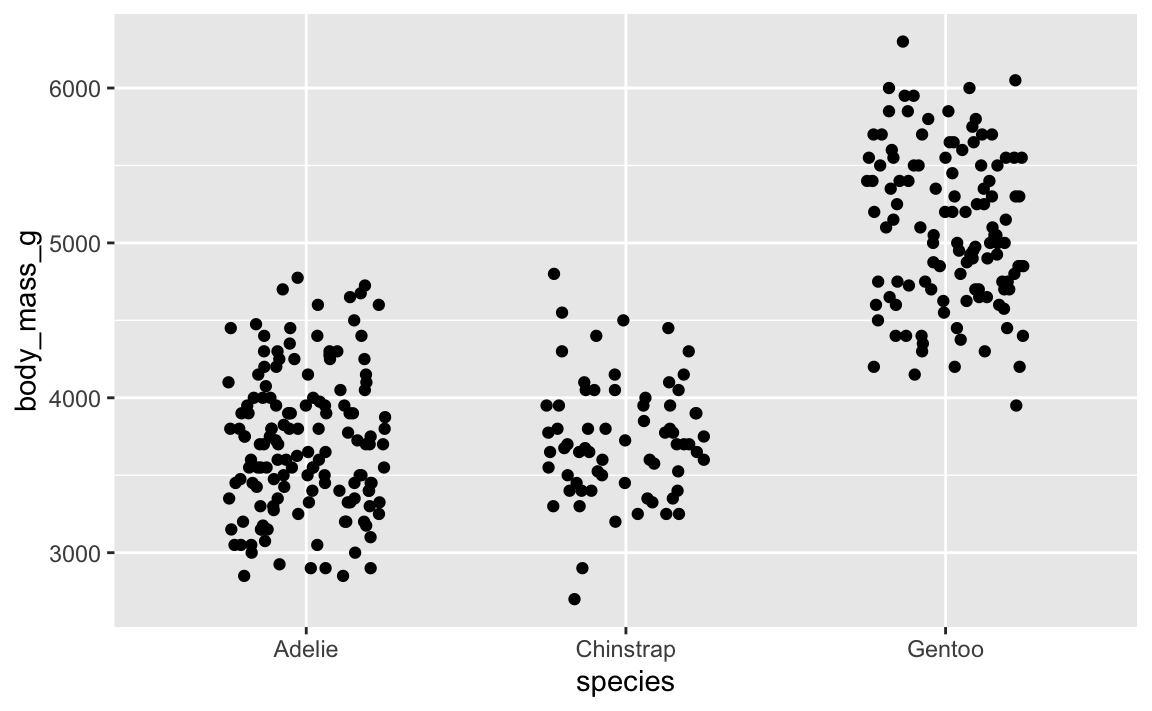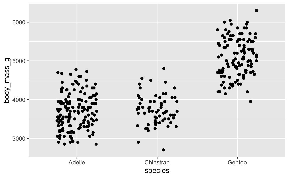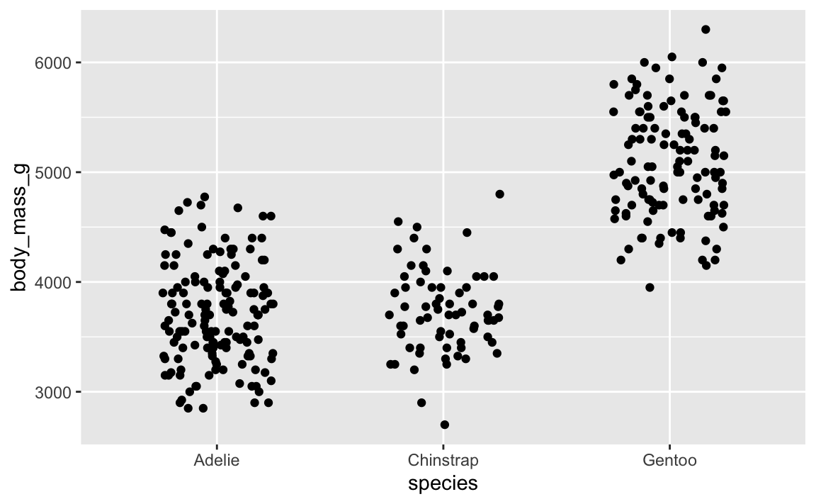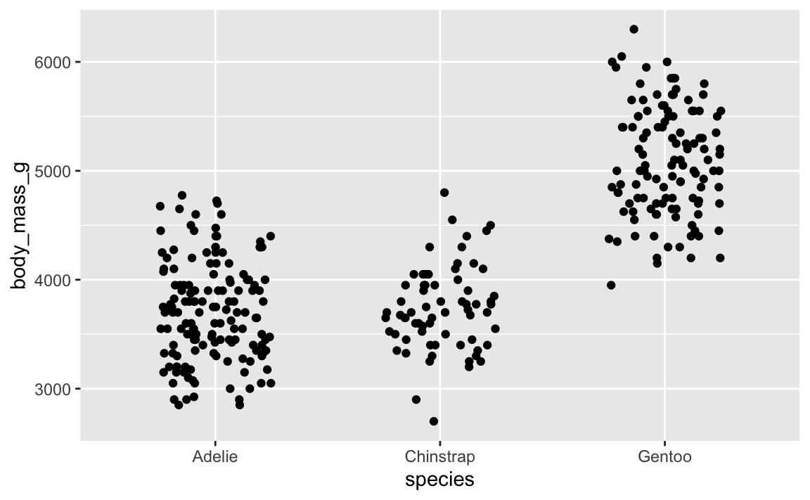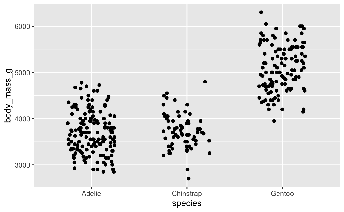 penguins <- palmerpenguins::penguins |>drop_na(sex)ggplot(penguins, aes(x = species, y = body_mass_g)) +# height = 0 makes it so points don't jitter up and downgeom_point(position =position_jitter(width =0.25, height =0))