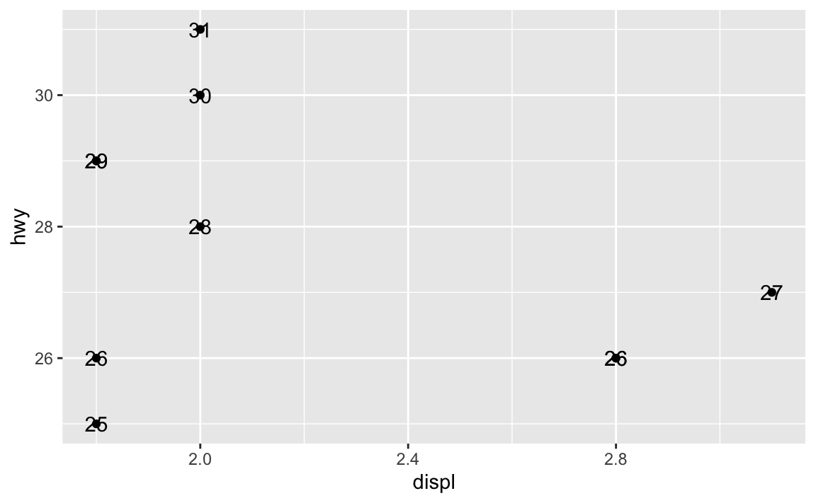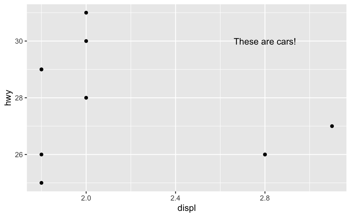 For example, there’s an empty space in this plot in the upper right corner. Let’s put a label at displ = 2.8 and hwy = 30, since there’s no data there:
