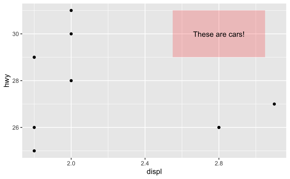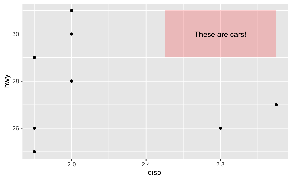 ggplot(mpg_small, aes(x = displ, y = hwy)) +geom_point() +annotate(geom ="rect", xmin =2.5, xmax =3.1, ymin =29, ymax =31, fill ="red", alpha =0.2 ) +annotate(geom ="text", x =2.8, y =30, label ="These are cars!")