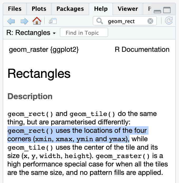 In that same help page, it mentions that geom_tile() is an alternative to geom_rect(), where you define the center of the rectangle with x and y and define the width and the height around that center. This is helpful for getting rectangles centered around certain points. I just eyeballed the 2.5, 3.1, 29, and 31 up there ↑ to get the rectangle centered behind the text. I can get it precise with geom_tile() instead: