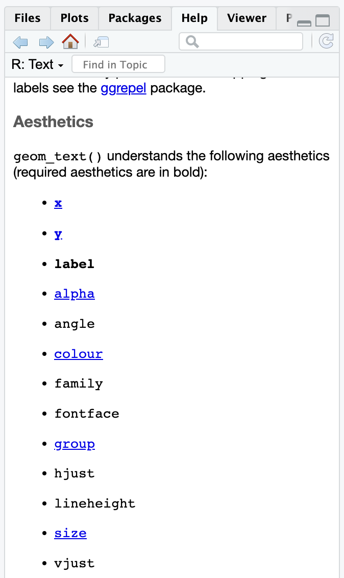 The help page for every geom has a list of possible and required aesthetics. Aesthetics that are in bold are required. Here’s the list for geom_text()—it needs an x, y, and label, and it can do a ton of other things like color, alpha, size, fontface, and so on: