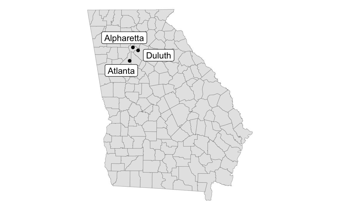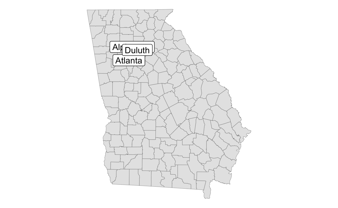 Recall from this FAQ post that anything you set in ggplot(), both data and aes(), applies to all the other geom layers that come afer. If you’re plotting one layer of geographic data, this will totally work, since the only_georgia dataset here will apply to all the other geom layers (and here, there’s only one of those):