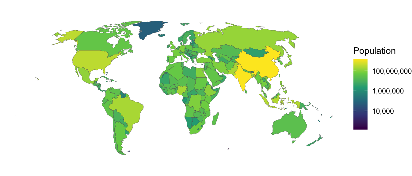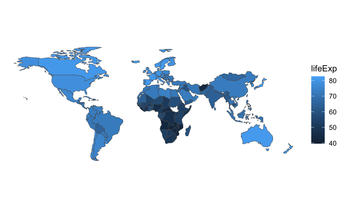 library(countrycode) # For dealing with country names, abbreviations, and codeslibrary(gapminder) # Global health and wealthlibrary(rnaturalearth) # For global shapefiles# Add an ISO country code column to gapminder for joininggapminder_clean <- gapminder |>mutate(ISO3 =countrycode(country, "country.name", "iso3c"))world_map <-ne_countries(scale =110) |>filter(admin !="Antarctica") |># Bye penguinsmutate(ISO3 = adm0_a3) # Use adm0_a3 as the main country code column