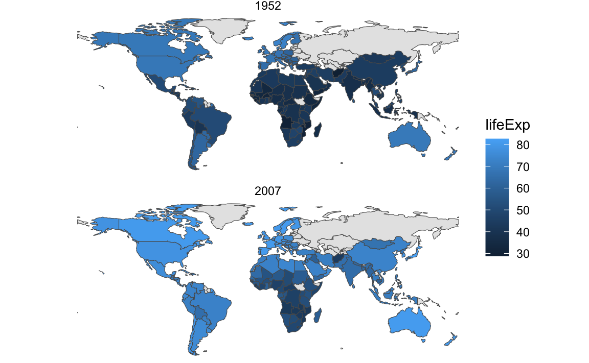 What if we want to facet though? This is just one year—what if we want to show panels for multiple years? This gets a little tricky. The gapminder data has rows for different country/year combinations (Afghanistan 1952, Afghanistan 1957, Albania 1952, etc.), but the world map data only has rows for countries. If we join the gapminder data to the world map data and gapminder has multiple rows for years, there’s no clear place for the gapminder rows to connect with the world map rows. R will try to make it work and repeat world_map rows for each of the repeated years, but it can be unpredictable.