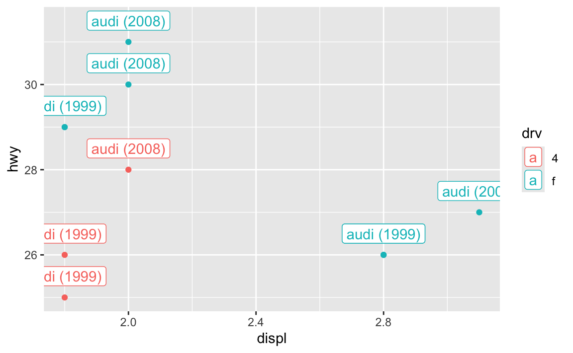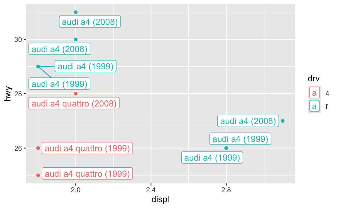 small_mpg <- mpg |># Only use the first 10 rowsslice(1:10) |># Make a label columnmutate(fancy_label = glue::glue("{manufacturer} ({year})"))ggplot(small_mpg, aes(x = displ, y = hwy, color = drv)) +geom_point() +geom_label(aes(label = fancy_label), nudge_y =0.5)
