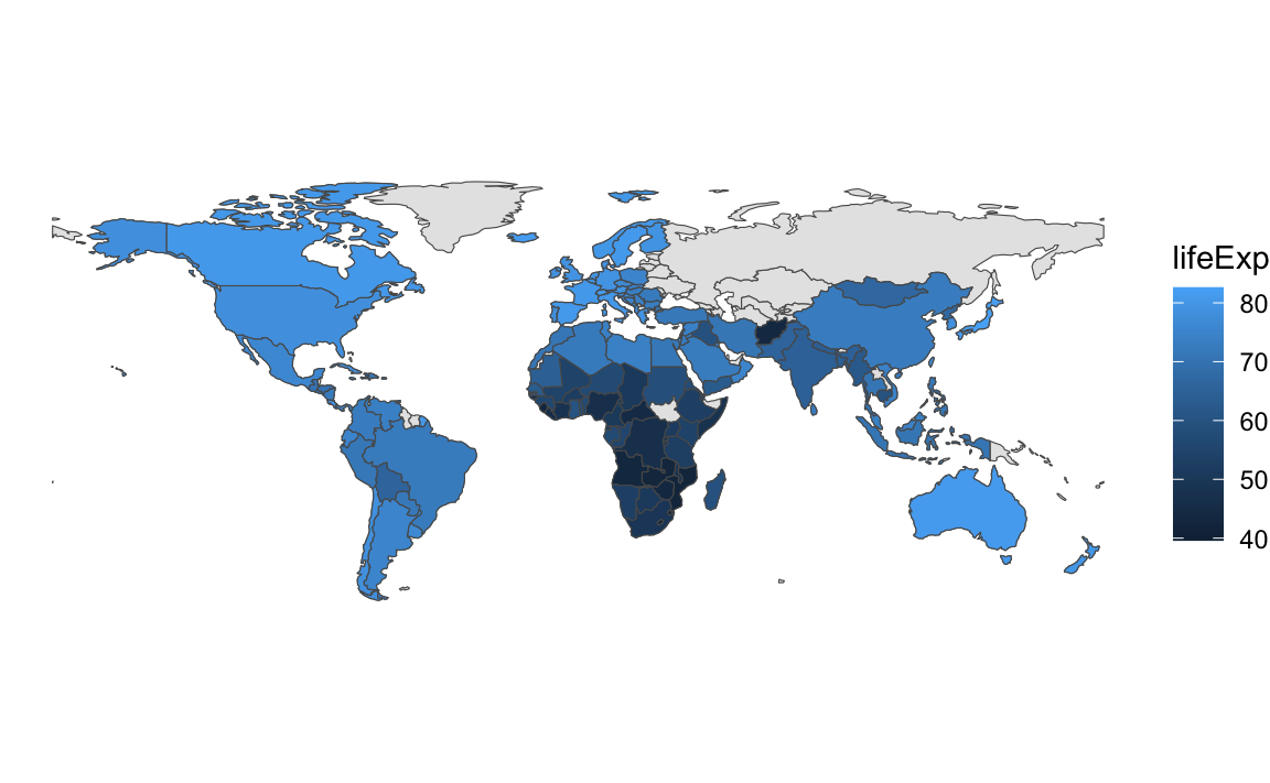 map_with_gapminder <- world_map |>left_join(filter(gapminder_clean, year ==2007), by =join_by(ISO3))ggplot() +geom_sf(data = map_with_gapminder, aes(fill = lifeExp)) +theme_void() +# Make the countries with missing data a different colorscale_fill_gradient(na.value ="grey90")